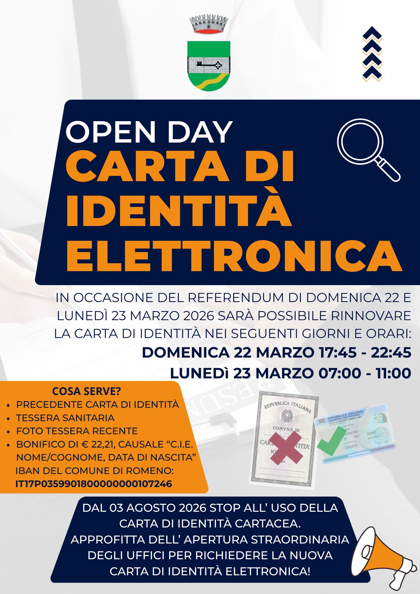 Descrizione In occasione del Referendum di domenica 22 e lunedì 23 marzo 2026 sarà possibile rinnovare la carta di identità nei seguenti giorni e orari: domenica 22 marzo 17:45 - 22:45lunedì 23 marzo 07:00 - 11:00